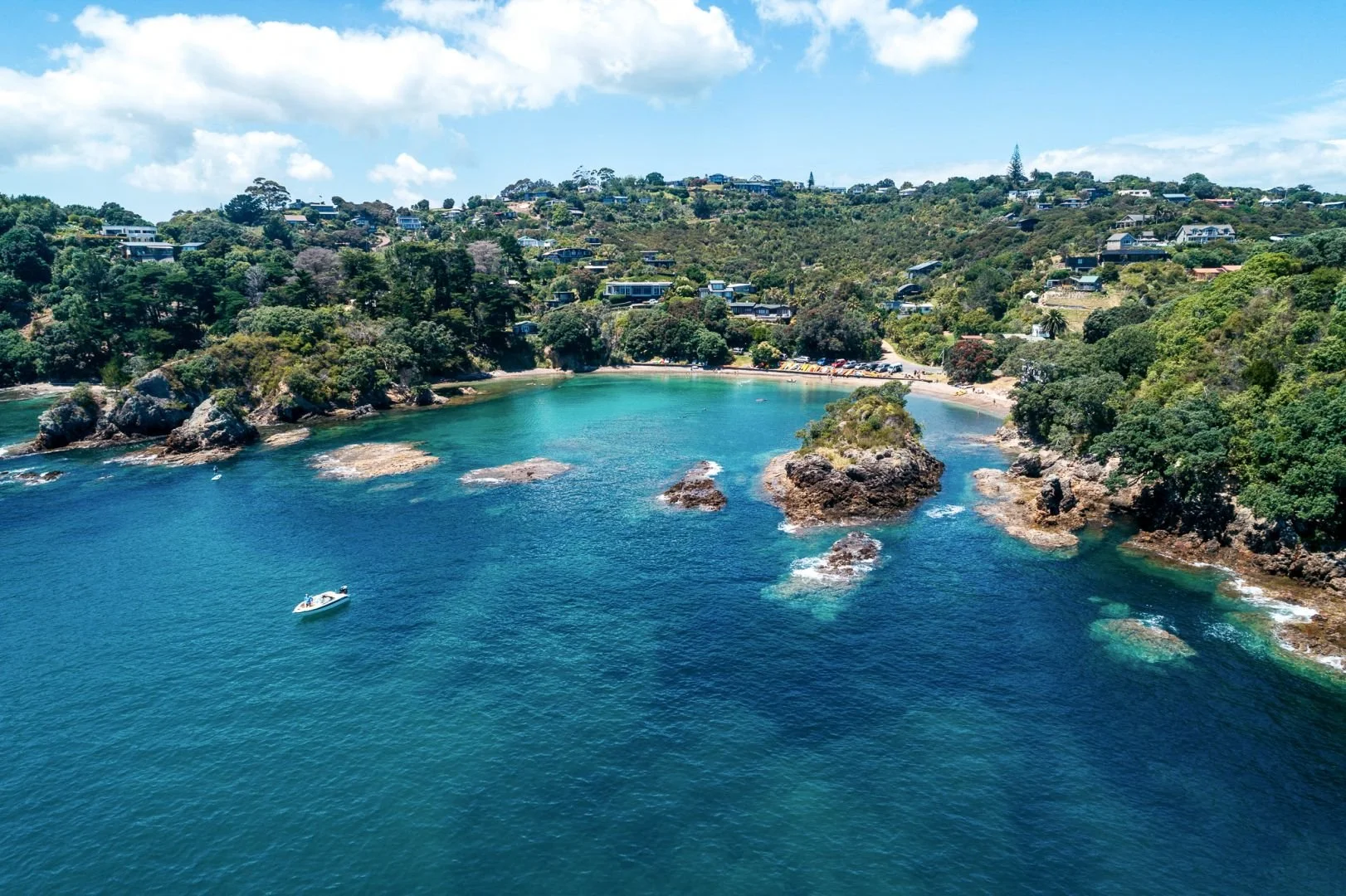 Enclosure Bay is a hidden gem on Waiheke Island, offering warm, sheltered waters ideal for swimming. Partially separated from the open sea by natural rock formations, it creates a safe environment perfect for families and snorkelling enthusiasts. The area is also known for its rock pools and coastal outcrops, providing opportunities for exploration.